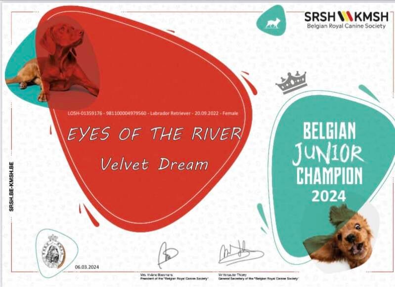 Internationale hondenshow Genk Eyes Of The River Velvet Dream (Jill) kreeg 1 uitmuntend in de jeugdklas en werd beste jeugd, hiermee veroverde ze haar eerste punt om Belgisch Jeugdkampioen te worden, met dank aan keurmeester Kelveri-Filippou Sonia